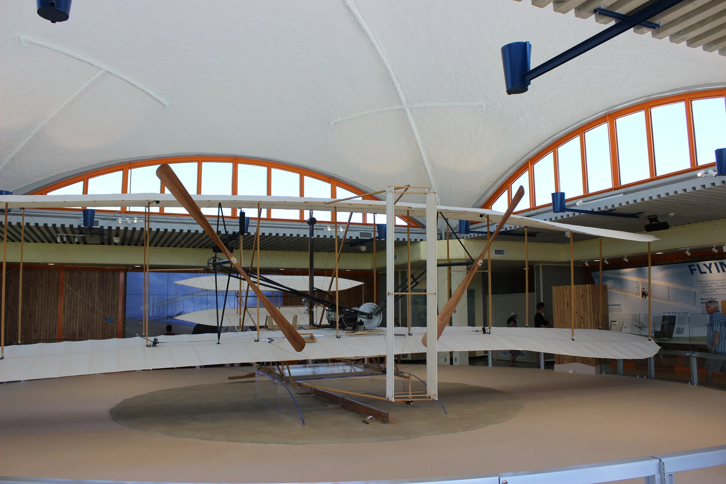 The site is open year-round to visitors. A memorial tower sits atop Kill Devil Hill overlooking the site, which includes the visitor center, stone markers indicating the length of each flight and a replica of the Wright Brother’s hanger. Inside the visitor center is a scale model of the 1903 Wright Flyer that was assembled under the direction of Orville Wright.